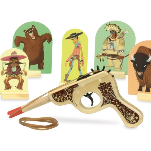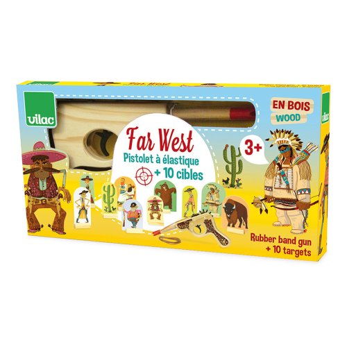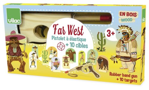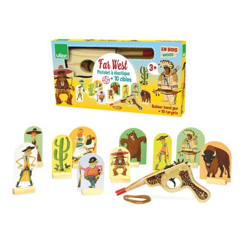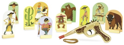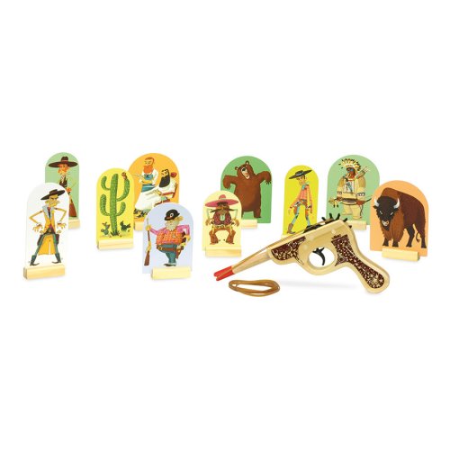 Divoký západ! Westernová hra, ve které vyhrává ten, kdo sestřelí nejvíce cílů. Jednoduše natáhněte gumičku na dřevěnou pistolku, postavte terče a můžete začít střílet. Hlavní vlastnosti: trénuje přesnost