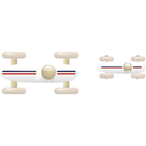 Model bílého vintage auta ze závodu Grand Prix. Vyrobeno z lakovaného dřeva ve Francii. Má velká bílá gumová kola, která zajišťují tichý chod na všech podlahách. Hlavní vlastnosti: vyrobeno ve Francii