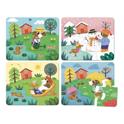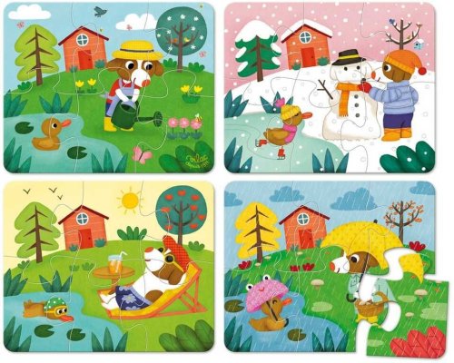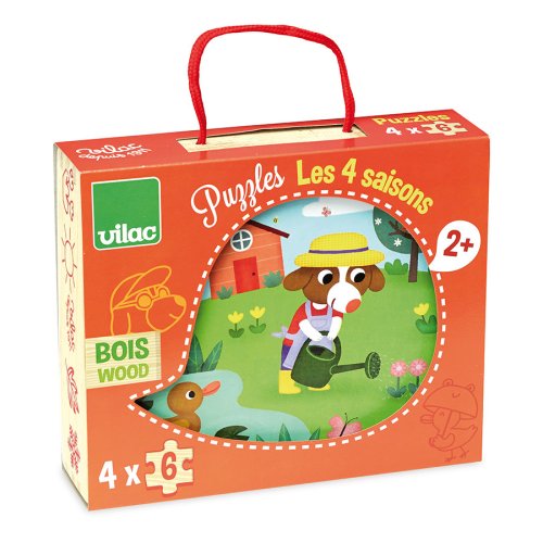 Čtvery dřevěná puzzle o šesti dílcích s tematikou čtyř ročních období. Zabaleno v pěkném dřevěném boxu s bavlněnou rukojetí. Hlavní vlastnosti: 4 puzzle po 6 dílcích praktický úložný box