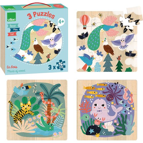 Sada 3 obrázkových puzzlí v praktické krabičce. Ilustrace Michelle Carlslund představují tři scény různých přírodních prostředí na souši, v moři a na obloze. Scéna v oblacích s velmi krásným pávem, orlem, sovou a dalšími různými ptáky. Další scéna ve vlnách s velkou velrybou, chobotnicí, mořskými koňmi a jejich přáteli rybičkami. Konečně poslední v džungli s tygrem, který se baví s krokodýlem, hadem a papouškem. Puzzle podpoří učení obratnosti a pozorování. Hlavní vlastnosti: obsahuje 3x16 dílků design Michelle Carlslund Cestujte s námi v naivním a elegantním světě dánské ilustrátorky Michelle Carlslund, světě jemných barev, který je plný roztomilých medvědů a přátelských ptáčků. V roce 2010, když Michelle ještě studovala grafický design, vytiskla doma své ilustrace a zkusila je prodat na designovém trhu, kde se setkaly s velkým úspěchem! Několik obchůdků chtělo začít prodávat její výtvory, a tak ji napadlo, že by bylo fajn začít podnikat. Michelle se rychle stala uznávanou nezávislou ilustrátorkou. Dnes lze její ekologická grafická díla zakoupit po celém světě v designových buticích, papírnictvích a dětských obchodech. Michelle se inspiruje vším kolem ní. Její výtvory jsou něžné a poetické, stylizovaný a dětinský styl, který se perfektně prolíná s hračkami firmy Vilac. „Jsem hranolky milující, časová optimistka a tvůrkyně ekologických plakátů a ilustrátorka na volné noze se sídlem v dánské Kodani,“ to by řekla ilustrátorka Michelle Carlslundová, kdyby se měla popsat jednou větou.