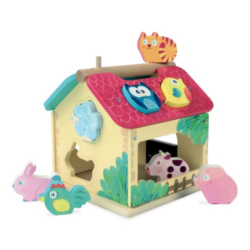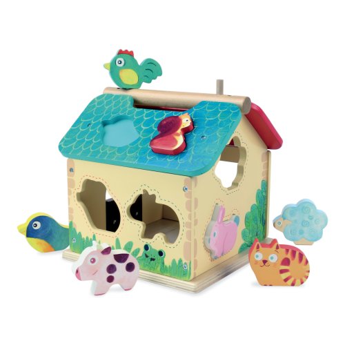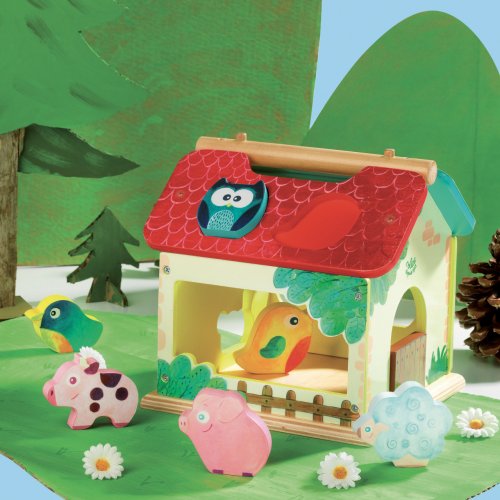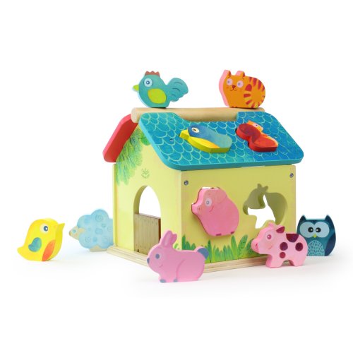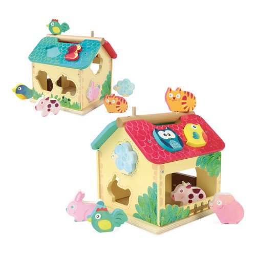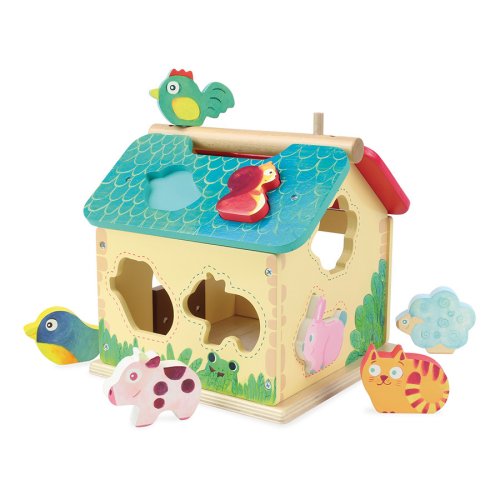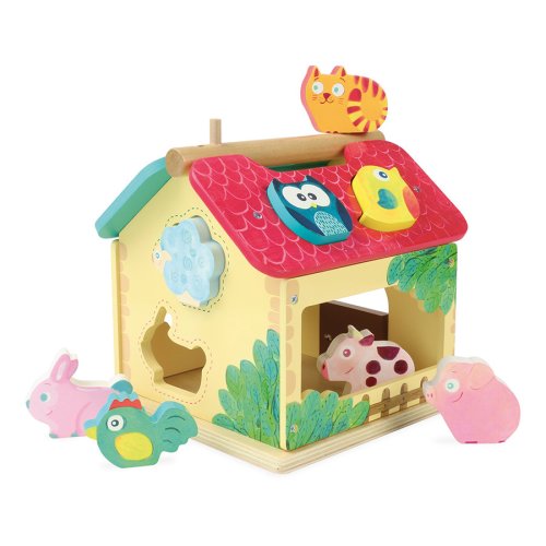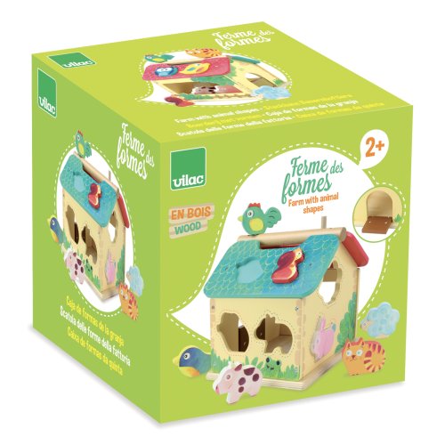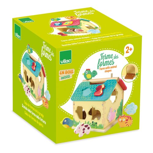 Dřevěná barevná farma s vkládacími otvory pro každé ze zvířátek. Děti se při hře učí poznávat tvary, barvy a zvířata, trénují si jemnou motoriku. Obsahuje deset dřevěných zvířátek. Hlavní vlastnosti: obsahuje 1 domeček a 10 zvířátektrénuje jemnou motoriku dětí