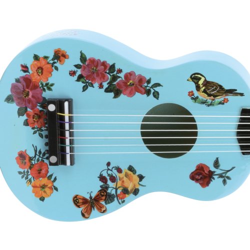 Klasická dřevěná akustická kytara se šesti strunami, v tyrkysové barvě a s ilustracemi Nathalie Lété. Kytara má natažené nylonové struny, které lze pomocí kolíků ladit. Dodáváno s trsátkem a jednou náhradní strunou. Tuto hračku nelze pokládat za hudební nástroj. Hlavní vlastnosti: kytara, trsátko a náhradní strunadesign Nathalie Lété Nathalie Lété je francouzská návrhářka žijící a působící v Paříži. Za hlavní zdroje své inspirace označuje lidové i populární umění zemí původu svých rodičů, Číny a Německa. Zajímají ji ovšem také staré rytiny květin a zvířat či historické hračky z celého světa. Její práce vynikají barvami a poetikou, jsou označovány za naivní, s přesahem k art brut. Využívá a mísí různé techniky i média, což se odráží na rozsahu spoluprací s mnoha různými výrobci. Její podpis dnes nesou knihy, oděvy, užitná i dekorační keramika, bytové doplňky a samozřejmě hračky.