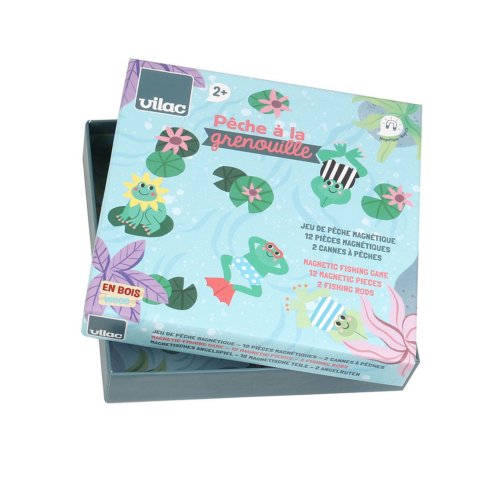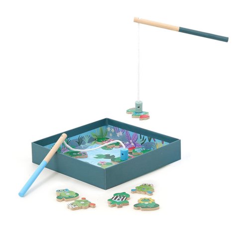Rybaření s rybičkami? To umí každý. Buďte originální a naučte se rybařit s žabkami od ilustrátorky Michelle Carlsund. K dispozici je celkem 12 roztomilých žab, každá v jiném tvaru i barevném designu. Chyťte je všechny! Každá žabka má na zadní straně různý počet teček, které označují body. Při hře tedy nezáleží na tom, kolik žab hráč vytáhne, ale nakonec se na již vytažených žabkách spočítají body a vyhrává ten, kdo má bodů více. Hra stimuluje kognitivní vývoj vašeho dítka. Rozvíjí koordinaci ruka-oko a jemnou motoriku. Podporuje také smyslové a vzdělávací učení. Žabky jsou uloženy v krabičce, která se otevřením přemění na herní základnu. Hra obsahuje: 12 dřevěných magnetických žab, 2 dřevěné pruty s magnetem a 1 herní krabičku/základnu Hlavní vlastnosti:•klasická hra v inovativním designu•inspirováno Montessori hračkami•rozvíjí soustředění a trpělivost•napomáhá učení počítání a zapamatování si•učí o barvách a tvarech•úložná krabička, která se přemění na herní základnu•vhodné od 2 let
