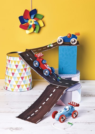 Červeno-modrý závoďák vyrobený z lakovaného dřeva s kovovými pogumovanými koly a šňůrkou k tahání. Dítka si jej mohou vzít kdekoliv s sebou. Vyrobeno ve Francii. Hlavní vlastnosti: podporuje rovnováhu a koordinaci pohybůvyrobeno ve Francii