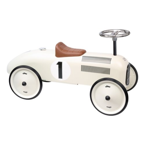 Odrážedlo Vintage ve stylu závodního auta je plně kovové a má krémovou metalickou barvu. Volant ovládá zatáčení předních kol. Hnědé sedadlo je vyrobeno z plastu. Kola odrážedla jsou pogumovaná a zaručují tak tichý chod i na pevném povrchu. Hlavní vlastnosti: stabilní kovové odrážedlo s pogumovanými kolystylový originální designnosnost 20 kg