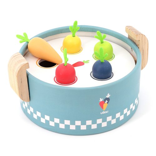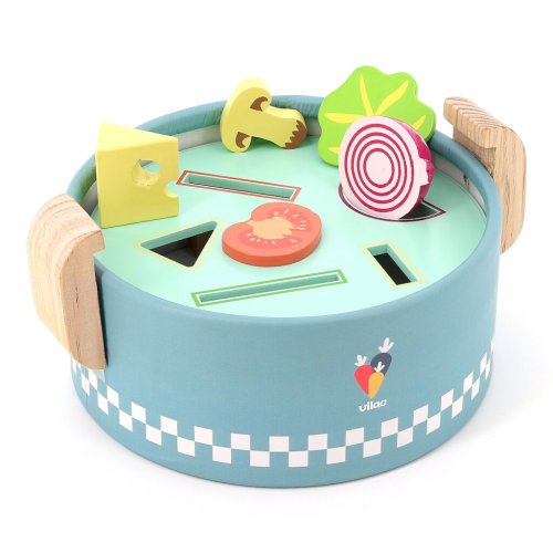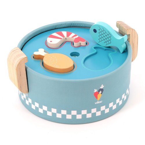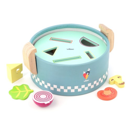 Co bude dnes k obědu? To je překvapení, které ukrývá důvtipná vkládačka v podobě malého hrnce. Pod jeho víkem naleznete tři výměnné desky s mnoha různými otvory, do nichž lze vkládat, nebo jimi vhazovat rozmanité pestrobarevné ingredience. Děti tak mohou zábavným způsobem cvičit rozpoznávání tvarů i barev a zdokonalovat svou motoriku. Díky praktickému balení lze všechny součásti snadno uklidit a uložit. Hračka kombinuje díly z odolného kartónu a pečlivě opracovaného dřeva. Hlavní vlastnosti: hrnec s víkem, 3 děrované desky a 13 dílků ke vkládáníjedinečný design a zpracovánípraktické balení