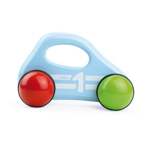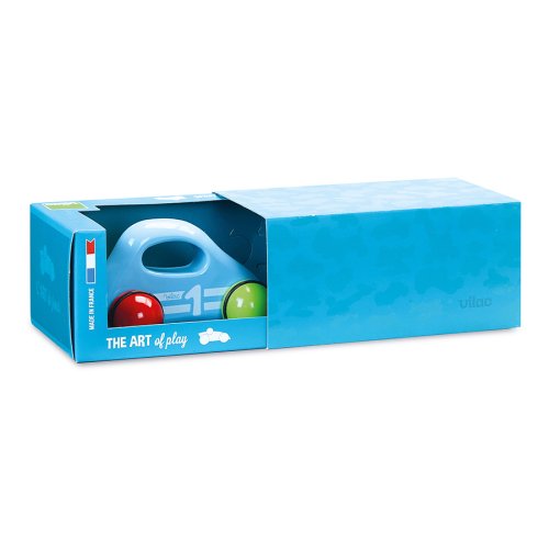 Modré závodní auto speciálního dizajnu, vyrobeno z lakovaného dřeva s čtyřbarevnými pogumovanými koly. Je vhodné jak ke hraní tak jako dekorace do pokojů dětí či dospělých. Vyrobeno ve Francii. Hlavní vlastnosti: vyrobeno ve Francii