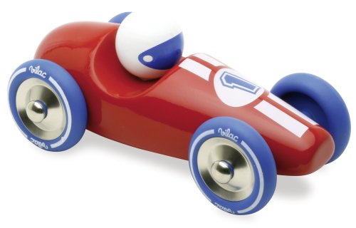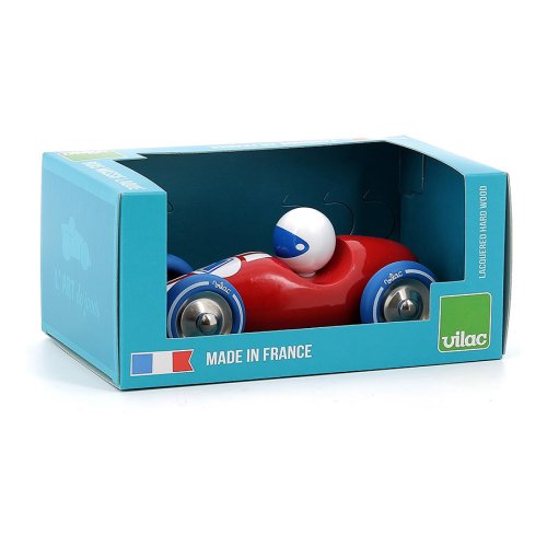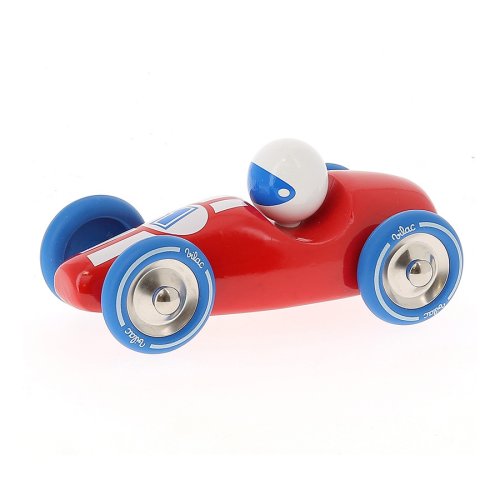 Červené závodní auto vyrobeno z lakovaného dřeva s kovovými pogumovanými koly. Je vhodné jak ke hraní tak jako dekorace do pokojů dětí či dospělých. Vyrobeno ve Francii. Hlavní vlastnosti: vyrobeno ve Francii