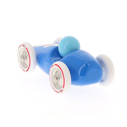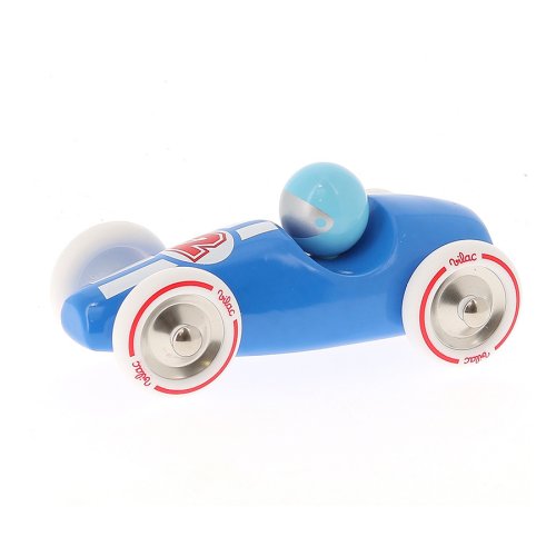 Modré závodní auto vyrobeno z lakovaného dřeva s kovovými pogumovanými koly. Je vhodné jak ke hraní tak jako dekorace do pokojů dětí či dospělých. Vyrobeno ve Francii. Hlavní vlastnosti: vyrobeno ve Francii