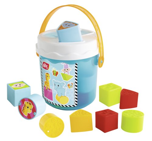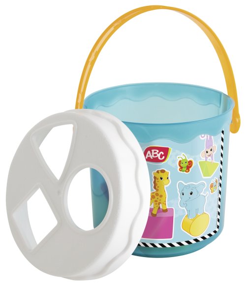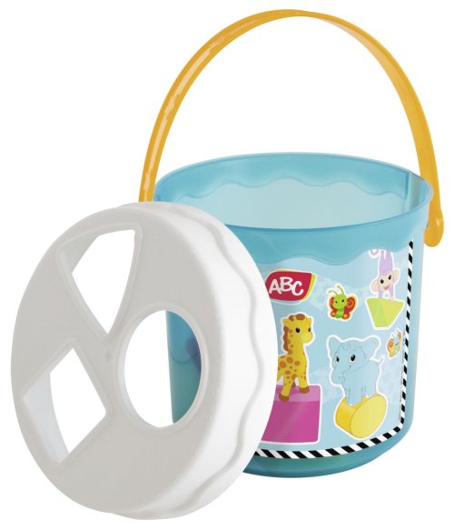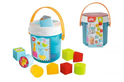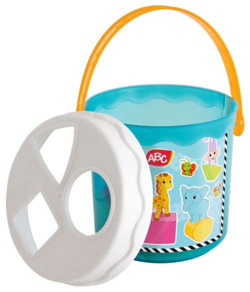 Barevné kostky v kyblíku s víkem se třemi různými otvory pro vkládání dle tvaru, 11 ks, velikost kyblíku 15 cm.