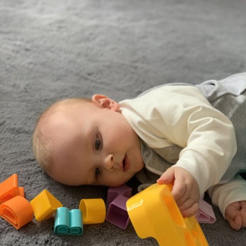 Na horní straně vkládacího kyblíka Baby Mix je 8 různých otvorů, do kterých lze vložit 16 různobarevných geometrických tvarů a písmenek. Hračka rozvíjí hmat, zrak a poznávací schopnosti. Kyblík umožňuje pohodlné přenášení.