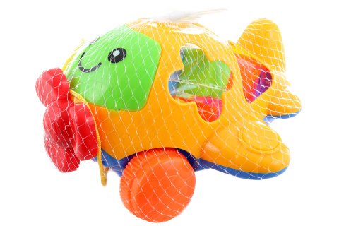 Vkládačka s motivem veselého letadla. Materiál plast. Součástí balení 5 kostiček různých tvarů. Rozměry letadla 20x11x20 cm. Baleno v síťce. Věk 3+