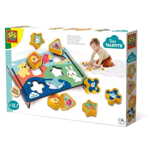 Tato dřevěná vkládačka na vkládání tvarů z řady Tiny Talents pomáhá dětem hravě objevovat tvary, barvy a zvířata. Děti se učí, jaké tvary patří ke kterým zvířátkům, a zároveň rozvíjejí svou jemnou motoriku a prostorovou představivost.Veselé ilustrace s motivem safari ukazují, která zvířata se k sobě hodí a co ráda jedí, což dodává hře další edukativní rozměr. Díky kombinaci dřevěné základny a plastových dílů se jedná o bezpečné a trvanlivé Montessori hračky, které se snadno uchopí do malých rukou. Sada obsahuje: Dřevěná vkládací deska: Deska s otvory na vkládání tvarů s motivem safari.Plastové tvary: 8 barevných plastových dílů v různých základních tvarech.Nálepky na tvary: Nálepky s veselými ilustracemi zvířat.