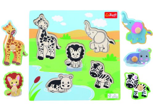 Dřevěné puzzle, základna s drážkami a pěti odnímatelnými kusy s rukojeťmi. Úkolem dítětě je umístit puzzle na správné místo. Hračka pomáhá procvičovat jemnou motoriku dítěte a přizpůsobování tvaru. Pro děti od 18 měsíců.