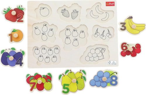 Vkládačka pro nejmenší s obrázky ovoce a čísly, které odpovídají počtu kusů daného ovoce. Děti se učí poznávat ovoce, barvy a seznamují se s počty a čísly. Dítě se podle obrysů a tvaru snaží najít správný obrázek (rozvoj představivosti a logického myšlení), a umístit jej do správného otvoru (rozvoj jemné motoriky). Vkládačka obsahuje osm dílků s úchytkami a podkladové obrázky.