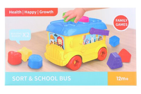 Plastová vkládačka ve tvaru školního autobusu o rozměru cca 19,5 x 14,5 x 14 cm. Vkládačka obsahuje 16 kostek různých tvarů na vkládání. Rozměr balení cca 24,5 x 14,5 x14,5 cm. Věk 12m+