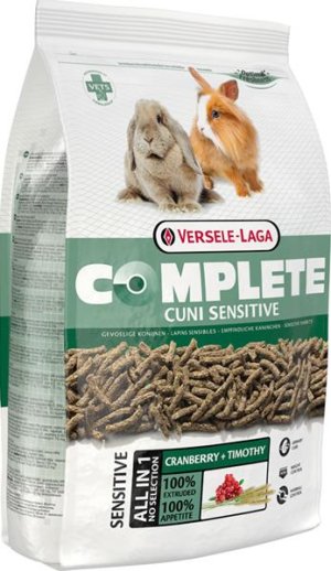 Versele-Laga Complete Cuni Sensitive poskytuje výživu bez zbytečných starostí. Výjimečná chutnost pelet vše v jednom předchází vybíravosti. Tak váš králík dostane všechny nezbytné prvky výživy a zůstane zcela zdravý. Krmivo s přírodně dlouhou vlákninou pomáhá předcházet trichobezoárům a obezitě. Optimální obsah vápníku a výtažek z brusinek pomáhá udržovat zdravé močové cesty. Versele-Laga Complete Cuni sensitive je vyvinuto veterináři na základě moderních vědeckých poznatků.
