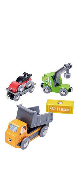 Sada technických vozidel 3 v 1. Prozkoumejte barvy a typy vozidel. V sadě najdete zelený jeřáb společně s nákladem, oranžové nákladní vozidlo a odtahový přívěs s červeným sportovním autem. Vozidla jsou kompatibilní se všemi vláčkovými sadami Hape a díky magnetům je můžete zapojit do jakékoliv vlakové soupravy. Vyrobeno z kvalitního FSC dřeva a plastu. Rozměry balení: 12 x 36 x 3,8 cm. Věk: 18 m+