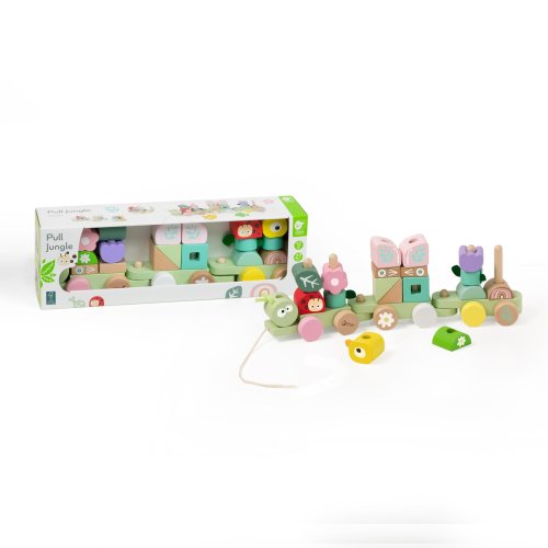 Barevný dřevěný vláček s motivem džungle přináší zábavu na kolečkách i při skládání! Skládá se z lokomotivy a dvou vagónků, které jsou osazeny dřevěnými kolíky pro navlékání 27 různorodých dílků. Děti si rozvíjejí jemnou motoriku, učí se barvy, tvary i logiku skládání. Díky tahacímu provázku si mohou vláček snadno vzít s sebou po celém bytě. Hrací set v jemných pastelových barvách zaujme každé zvídavé batole. Rozměr balení: 38 × 12 × 8 cm Vhodné pro děti od 12 měsíců