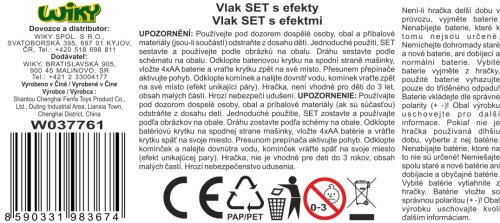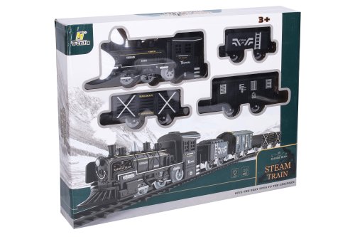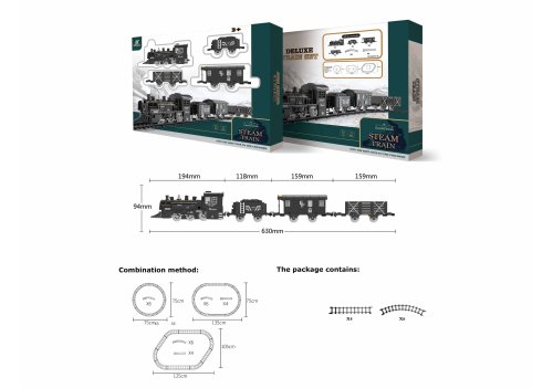 Vlak set. Rozměry železnice 135x75 cm, velikost mašinky 20 cm, vagónů 10-15 cm. Možnost složit 3 různé tratě. Světelné, zvukové a kouřové efekty. 4xAA baterie ze spodní strany mašinky nejsou součástí. Přepínač ON/OFF na levém boku mašinky. Obsahuje, mašinku, 3 vagóny, 4 rovné kolejnice, 6 zahnutých kolejnic, nádobku na vodu. Nádržka na vodu pod stříbrným komínkem.