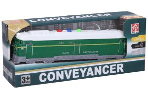 Vlak na setrvačník s efekty. Velikost 23 cm. Vydává světelné a zvukové efekty. Aktivace tlačítky na střeše (zvuky vlaku a železnice). Baterie 3xAG13, součástí balení.