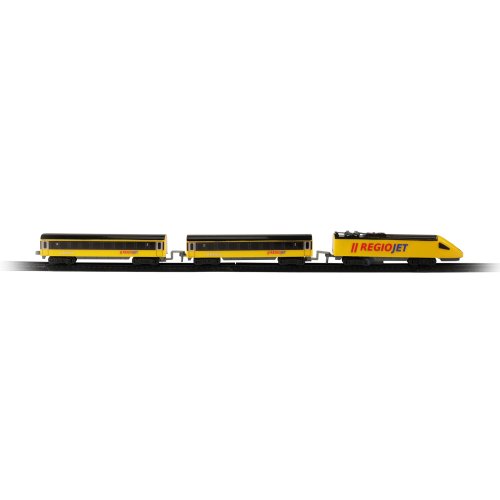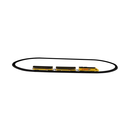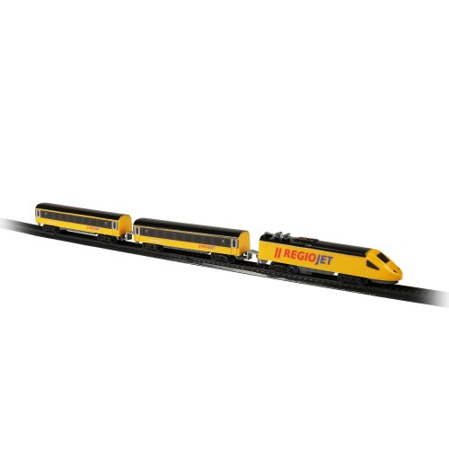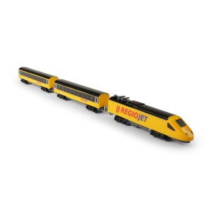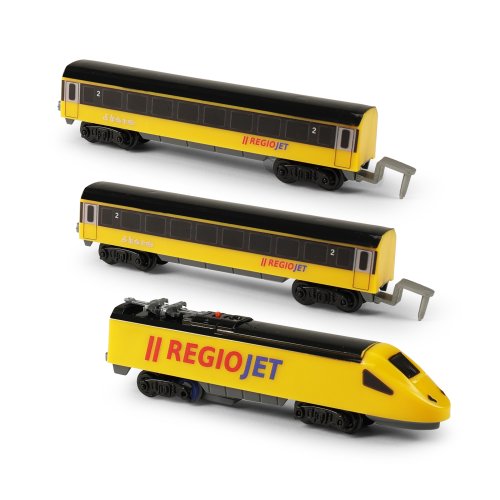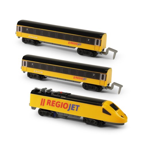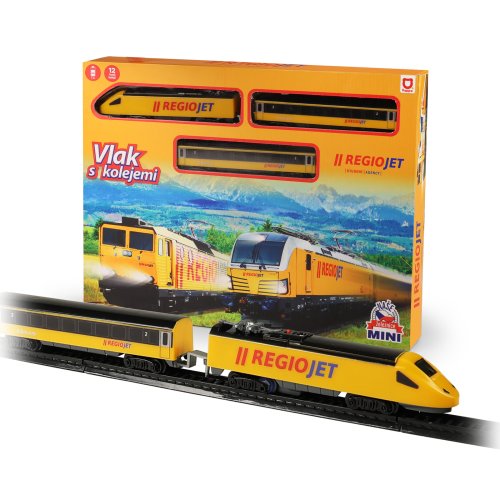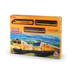 Milujete cestování vlakem? Tak sestavte koleje, postavte na ně lokomotivu, připojte vagóny a vzhůru za dobrodružstvím! Originální žlutý vlak RegioJet od Student Agency obsahuje žlutou lokomotivu a 2 žluté vagónky, 8 zahnutých a 4 rovné koleje. Lze vytvořit kolejiště až do velikosti 96 x 58 cm. Rozteč kolejí je 1,4 cm. Lokomotiva měří na délku 14 cm a vagón 13,5 cm. Lokomotiva jezdí na 1 ks AA baterie (není součástí), na střeše lokomotivy vypínačem ON/OFF (zapnuto/vypnuto) uvedete vlak do chodu. Vlak RegioJet MINI lze kombinovat s vlakem Pendolino MINI a Slovenské dráhy MINI.