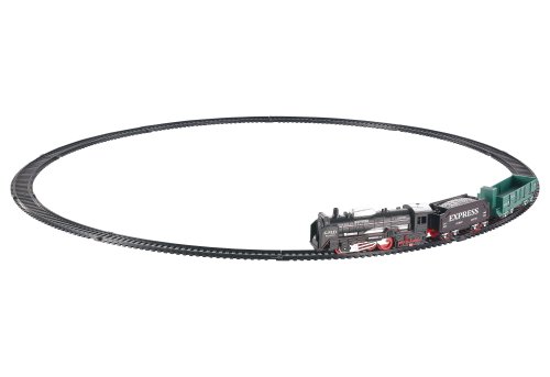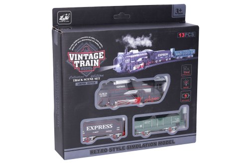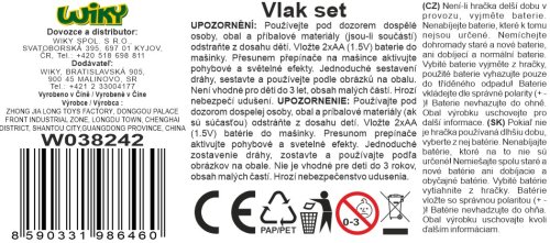 Vlak set. Rozměry železnice 68x68 cm, velikost mašinky 13 cm, vagónů 9-11 cm. Součástí mašinka, 2 vagóny. Světelné efekty. 2xAA baterie nejsou součástí. Přepínač ON/OFF na pravé straně mašinky.