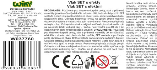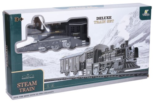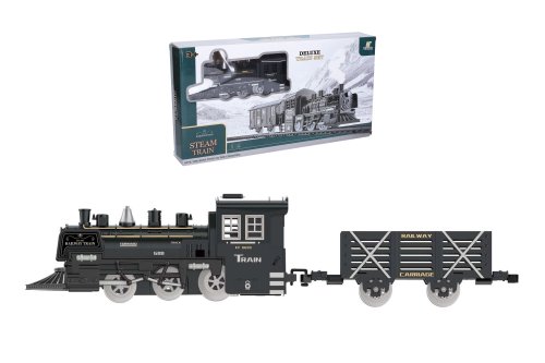 Vlak set. Rozměry železnice 75x75 cm, velikost mašinky 19,5 cm, vagónu 15,5 cm. Světelné, zvukové a kouřové efekty. 4xAA baterie do mašinky nejsou součástí. Přepínač ON/OFF na levé straně mašinky. Součástí mašinka, 1 vagón, 6 zahnutých kolejnic, nádobka na vodu. Nádržka na vodu pod stříbrným komínkem.