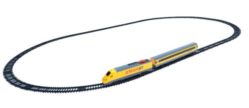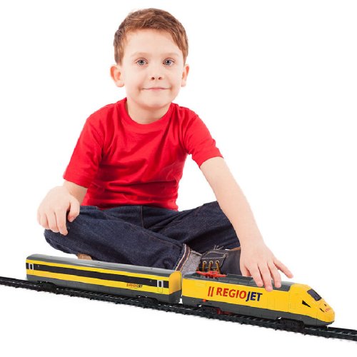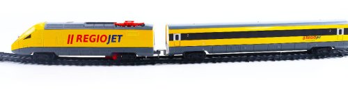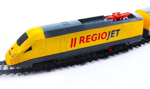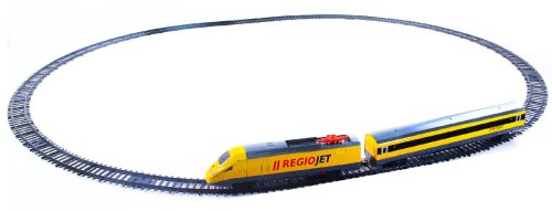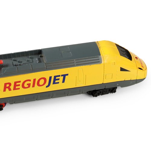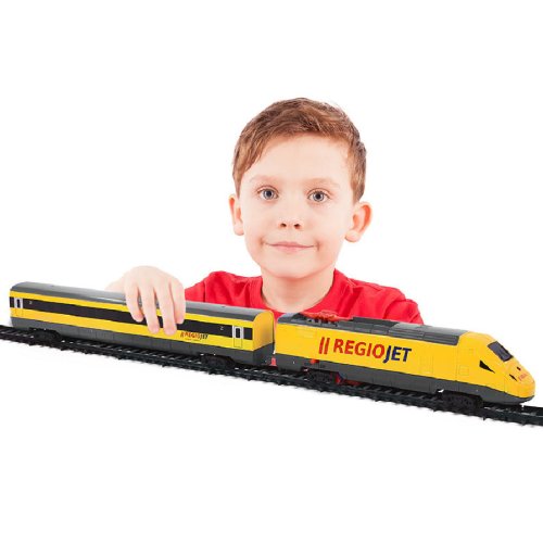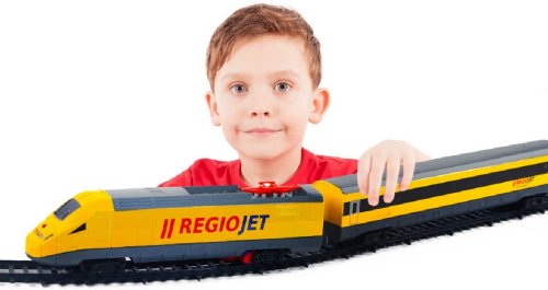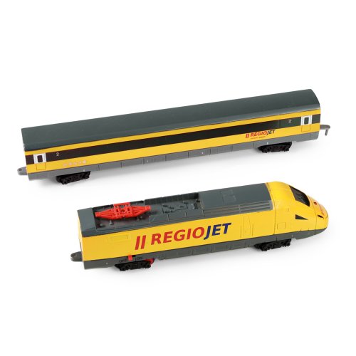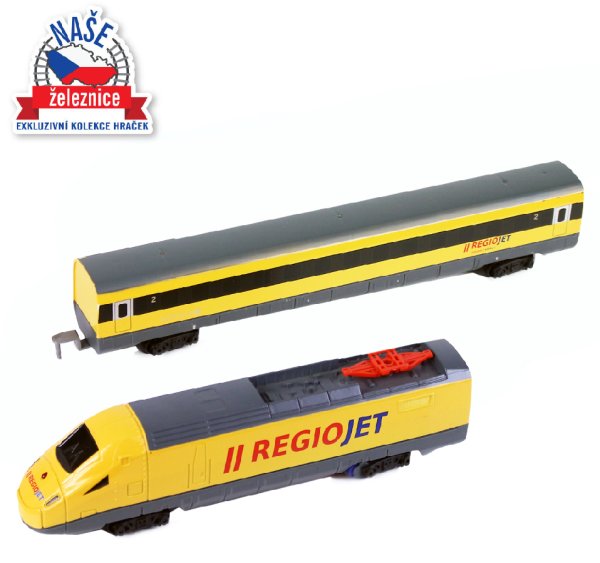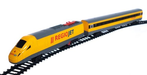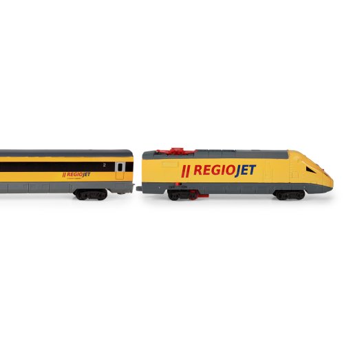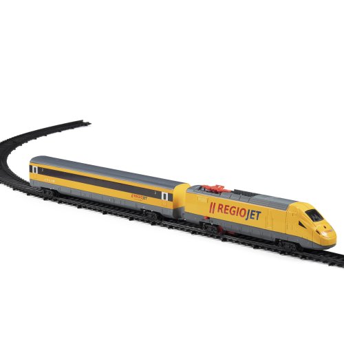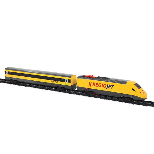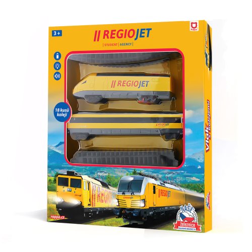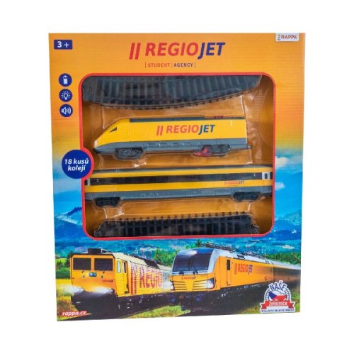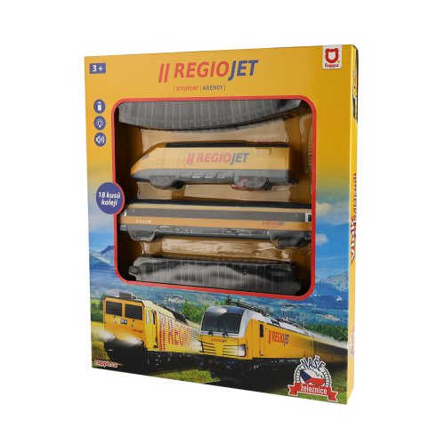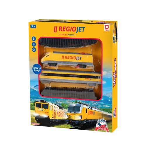 Originální žlutý vlak RegioJet od Student Agency. Sada obsahuje žlutou lokomotivu a žlutý vagón a koleje, ze kterých lze vytvořit kolejiště. Vlak vydává zvuk a svítí. Vhodné od 3 let.