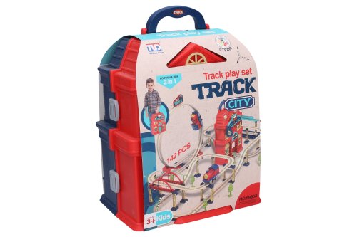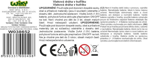Vlaková dráha v kufříku 142 dílků. Rozměry 110x46x36,5 cm. 2xAAA baterie do mašinky nejsou součástí. Komínek mašinky slouží jako tlačítko ON/OFF. Obsah - dráha, mašinka, 2 budovy, zastávka, most, závora, značka, stromy, světla. Obrázkový návod na sestavení na vnitřní straně obalové karty.