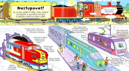 Seznam se díky této encyklopedické knížce, mající více než 60 odklápěcích okének, s různými typy vlaků. Prozkoumej je a zjisti něco nového! Seznam se díky této encyklopedické knížce, mající více než 60 odklápěcích okének, s různými typy vlaků – vlaků, které za slunečného dne, za deště či ve sněhu rachotí po kolejích a převážejí cestující a náklady zboží do všech koutů světa. Odklop tedy okénka a dozvíš se něco o historii vlaků, zjistíš nové informace o parních vlacích, o tom, jak lokomotivy pracují, o těch největších i o těch nejrychlejších vlacích, o vlacích v podzemí nebo těch, které zdolávají kopce. Tak honem nastupovat, jedeme!