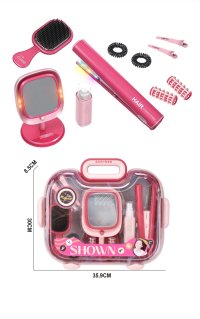 Dále sada obsahuje stolní zrcadlo s podstavcem, které je vybavené světelnými diodami po obvodu, což přispívá k autentickému zážitku ze hry. Kromě toho jsou zde i další nezbytné nástroje pro úpravu vlasů, jako je kartáč na vlasy, dva různé typy spon do vlasů, dva natáčky a dvě pružné gumičky. Všechny tyto doplňky jsou uspořádány v praktickém plastovém kufříku s průhledným víkem a držadlem, který usnadňuje přenášení i skladování celé sady.