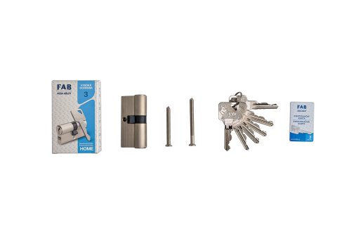 Cylindrická bezpečnostní vložka FAB 3 HOME je vhodná do dveří, které vyžadují trvale vysoké zabezpečení (dveře do bytu či domu, kanceláře, atd.), vysoká úroveň zabezpečení. Ochrana proti odvrtání, pro objekty vyžadující trvale vysokou bezpečnost. 6ti stavítkový uzamykací systém. Standartně v dodávce 6 klíčů. Mosazné těleso i bubínek. Systém chráněn patentem a užitnými vzory. Patentově chráněný paracentrický profil. Rozsáhlá rozměrová řada. Identifikační karta.
