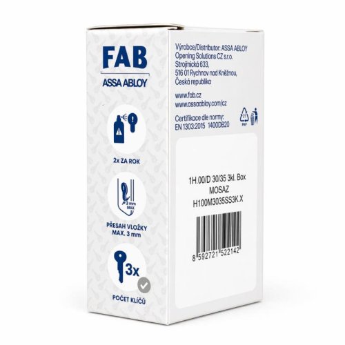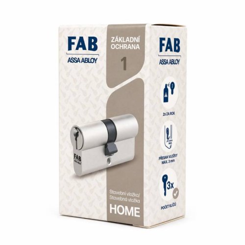 Cylindrická vložka FAB je určena k dočasnému uzavření nap. během stavby a pro objekty vyžadující základní úroveň zabezpečení. Obsahuje 5 stavítkový uzamykací systém. Povrchová úprava mosaz. Standardně dodáváno se 3 ocelovými klíči. Rozměr 30 + 35 mm. EAN 8592721522142