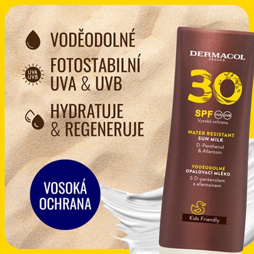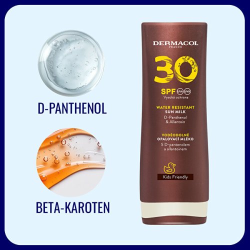 Voděodolné mléko s vysokým ochranným faktorem chrání pokožku před UV zářením a škodlivými vlivy slunečního záření.