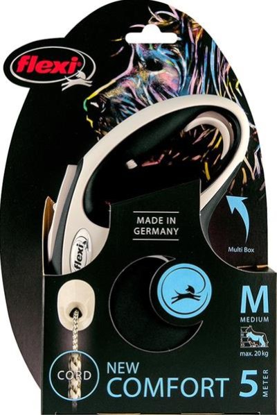 Dokonale navržené dvoubarevné vodítko Vás upoutá na první pohled. New Comfort nabízí všechny funkce, které potřebujete a proto si ho brzy zamilujete! Vylepšený brzdový systém s krátkým zdvihem umožňuje více kontroly, ergonomické držadlo je nastavitelné dle velikosti ruky (od velikosti M). Lze přidat i Multi Box pro ukládání pamlsků či sáčků (od velikosti S). Rodinná firma flexi vyrábí výhradně na území Německa. V závodě v Bargteheide u Hamburgu vzniká vše, počínaje návrhem až po výrobu vysoce kvalitních vodítek – Made in Germany. Firma flexi je vynálezcem samonavíjecího vodítka a jedničkou na světovém trhu, exportuje do více než 90 zemí světa. Originální samonavíjecí vodítka flexi se vyznačují patentovaným, po technické stránce nejmodernějším pružinovým systémem a komfortním ovládáním. Jsou vyráběna z vysoce kvalitních materiálů, exkluzivně manuálně zpracovaná a sestavená. Vodítka prochází před expedicí mnoha kontrolami kvality. Velikost: M – vhodné pro psy o hmotnosti do 20 kg. Typ vodítka: Navíjecí – lanko. Délka pásku/lanka: 5 m Barva: černá