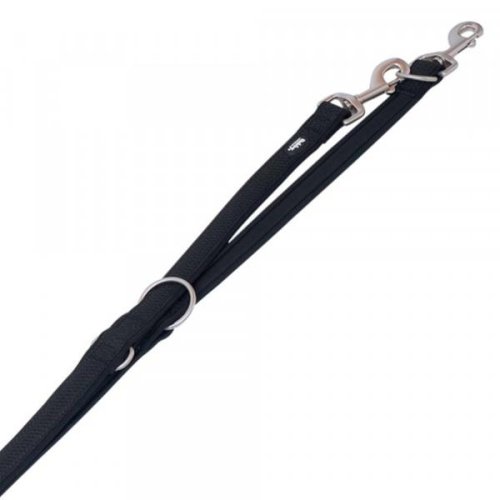 Vodítko je vyrobené z odolného černého nylonu se vzorem síťky podšitého neoprenem. Měkká rukojeť zajišťuje pohodlný úchop. Karabiny a přepínací kroužky jsou z matného kovu stříbrné barvy. Přepínací vodítko lze nastavit na 3 různé délky a celkově měří 2 metry. Hmotnost (cca): 238 g Materiál: nylon, neopren, kov. Velikost: M–L Rozměry (cca): délka 200 cm, šířka 2–2,5 cm Barva: černá
