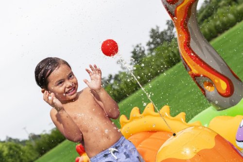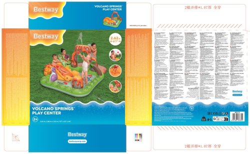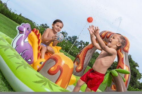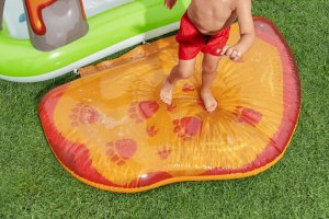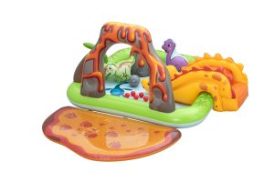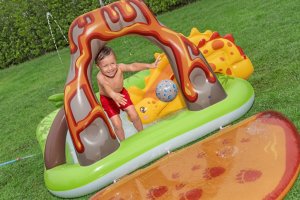 Ponořte se do vulkanického světa vodní zábavy s hracím centrem Volcano Springs™. Toto působivé centrum v sopečném designu s dinosaury slibuje hodiny zábavy a dobrodružství pro děti od 2 let. Prostorné vodní centrum nabízí spoustu zábavy. Skluzavka s měkkým polštářem zajistí rychlé sjezdy, zatímco oblouk s integrovaným rozprašovačem poskytuje osvěžující vodní sprchu. Dalším zajímavým prvkem je sopka s proudem vody pro pouštění hracích míčků, nafukovací palma nebo odnímatelná vodní podložka umístěná vedle bazénu. Bazénová část nabízí prostor pro dovádění ve vodě a díky integrovanému vypouštěcímu ventilu ji lze snadno vyprázdnit. Kapacita bazénku je 150 litrů a objem ve vodní podložce 80 litrů. Součástí sady je: 5 hracích míčků, nafukovací míč v podobě asteroidu, 2 nafukovací dinosauři Puffy Pal™ a opravná záplata. Odolný PVC materiál zajišťuje dlouhou životnost i při aktivním hraní. Maximální nosnost: 45 kg. Rozměry v nafouknutém stavu: 102 x 188 x 262 cm. Rozměry ve vyfouknutém stavu: 177 x 177 cm. Rozměry balení: 39 x 39 x 11 cm. Používejte pouze pod dohledem dospělé osoby. Věk: 2+
