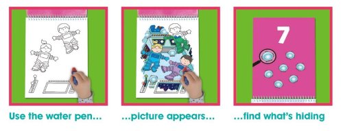 Vychází ze hry „Who‘s Hiding?“ (Na schovávanou). Tyto omalovánky obsahují ještě další aktivitu. Pomocí vodního pera dítě může odkrýt obrázek se zvířátky a předměty. Obrázky se vybarví a pak zase zmizí, a tak pořád dokola. Ideální pro cestování. Rozměry knížky: 265 x 210 x 147 mm
