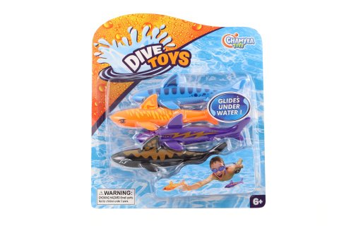 Žraloci na potápění. Balení obsahuje 4 barevné žraloky. Vhodné pro zpestření plaveckého a potápěčského výcviku nebo využití v domácím bazénu (pod dozorem dospělého). Materiál plast. Rozměr balení cca 22x19,5x4 cm. Věk 6+