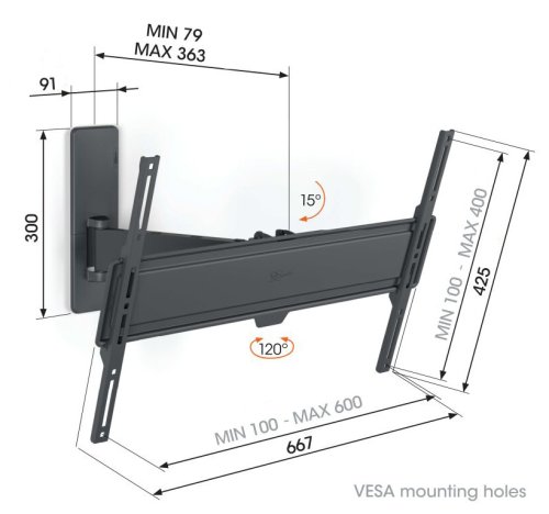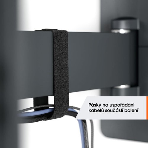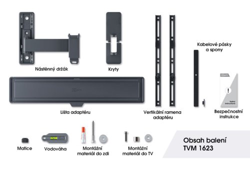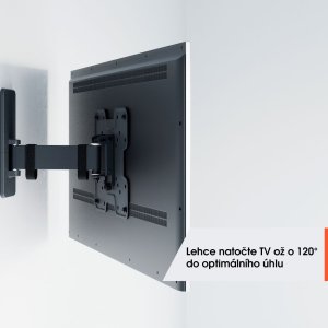 Nástěnné rameno s náklonem pro TV s úhlopříčkou 40-77 palců S tímto nástěnným držákem televizoru QUICK Full-Motion můžete televizor sledovat pohodlně, ať jste kdekoli v místnosti. Držák se může otáčet až o 120° a naklánět až o 15°. Instalace je velmi snadná. Televizor můžete pěkně a bezpečně připevnit na stěnu v max. 30 minut. TVM 1623 je vhodný pro televizory s úhlopříčkou 40 až 77 palců a hmotností do 35 kg.