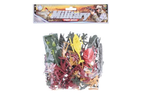 Vojáčci v sáčku. Balení obsahuje dvě barevné sady figurek o velikosti cca 5 cm, opevnění, tank, vrtulník a další doplňky. Baleno v sáčku. Rozměr balení cca 22 x 25 x 6 cm. Věk 3+