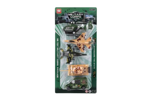Vojenský set. Na zpětné natažení a volná kola. Velikost vrtulníku 16,5 cm. Součástí vrtulník, 2 stíhačky, tank, auto.