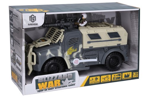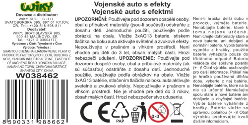 Vojenské auto s efekty. Velikost 31 cm. Zvukové a světelné efekty tlačítkem na levém boku auta. Volná kola. 3xAG13 baterie součástí.