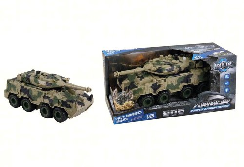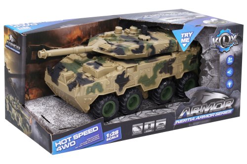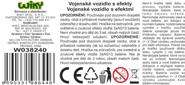 Vojenské vozidlo. Rozměry 25x11x10 cm. Na setrvačník. Světelné a zvukové efekty. 3xAG13 baterie součástí.