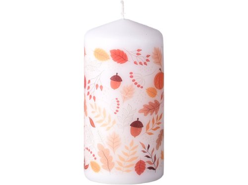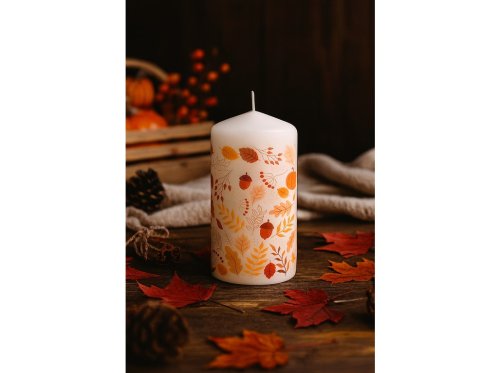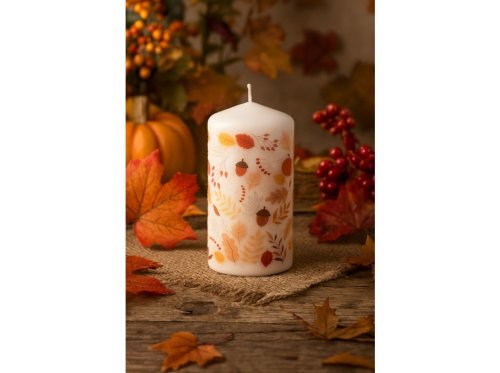 Klasická válcová svíčka s jemnou podzimní vůní a potiskem listí. Skvěle doplní sezónní dekorace a navodí hřejivou atmosféru. Výška 12 cm, průměr 6 cm.