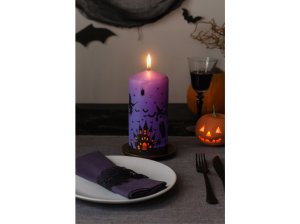 Originální fialová válcová svíčka s halloweenským nápisem „Boo“. Výborná pro výzdobu domácnosti během svátků duchů. Hodí se k dalším doplňkům v tmavých tónech.