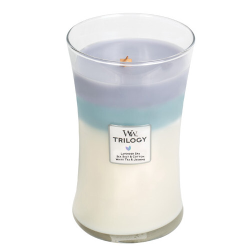 Svíčka Trilogy Calming Retreat vám přináší hřejivou a útulnou vůni.Tato svíčka s typickým dřevěným víčkem provoní váš domov a naplní ho jemným zvukem praskajícího knotu, který podpoří atmosféru pohodlí a útulnosti. Neboť domov je tam, kde praská oheň. Knot je vyroben z přírodního dřeva. Patentovaný tvar dřevěného knotu Pluswick® Innovation vytváří uklidňující zvuk praskajícího ohně. Jedinečný křížkový tvar tohoto dřevěného knotu umožňuje až 5x rychlejší rozpuštění voskového jezírka než klasický bavlněný knot. Proto rychle prodchne místnost příjemnou vůní. Tento patentovaný knot garantuje krásné a čisté hoření bez sazí na skle. Vytváří jemný zvuk praskajícího ohně. Dřevěné víčko poslouží jako podstavec pod svíčku při jejím hoření a chrání tak povrch nábytku. Lavender Spa – s uvolňující vůní esenciálních olejů speciálně sesbírané levandule a eukalyptu. Sea Salt & Cotton – s vůní mořské soli v kombinaci s bavlnou, s podtóny dřeva a mořského vánku. White Tea & Jasmin – čistý bílý čaj a špetka jasmínu se setkávají v něžném objetí s vůní červeného cedru a růže.