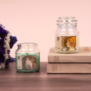 Vonná svíčka ve skleněném pouzdře se skleněným víčkem pro použití v interiéru.