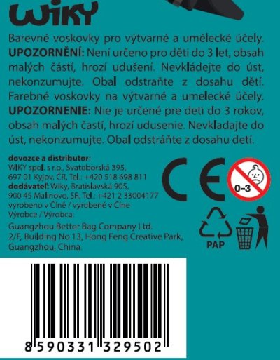 Seznam varování o bezpečnosti kříd vychází z požadavků nařízení (EU) 2023/988 o obecné bezpečnosti výrobků (GPSR): * Riziko spolknutí: Malé děti mohou vkládat křídy do úst, což hrozí udušením. Dohlížejte na dítě při hraní s křídami. * Alergie: Některé křídy obsahují látky, které mohou vyvolat alergické reakce. V případě výskytu alergií okamžitě přestaňte křídu používat. * Poškození povrchu: Používejte křídu na k tomu určených površích. Křída může trvale zašpinit nebo poškodit některé povrchy. * Ostré hrany: Zlomená křída může mít ostré hrany, které mohou způsobit poranění. Rozbité křídy vyhoďte do koše. * Udržování čistoty: Po použití si umyjte ruce a povrchy, na kterých byla křída používána. * Skladování: Křídy uchovávejte na suchém místě, mimo dosah malých dětí. * Použití: Křídy používejte podle jejich účelu (pro kreslení po tabulích, chodnících apod. ).